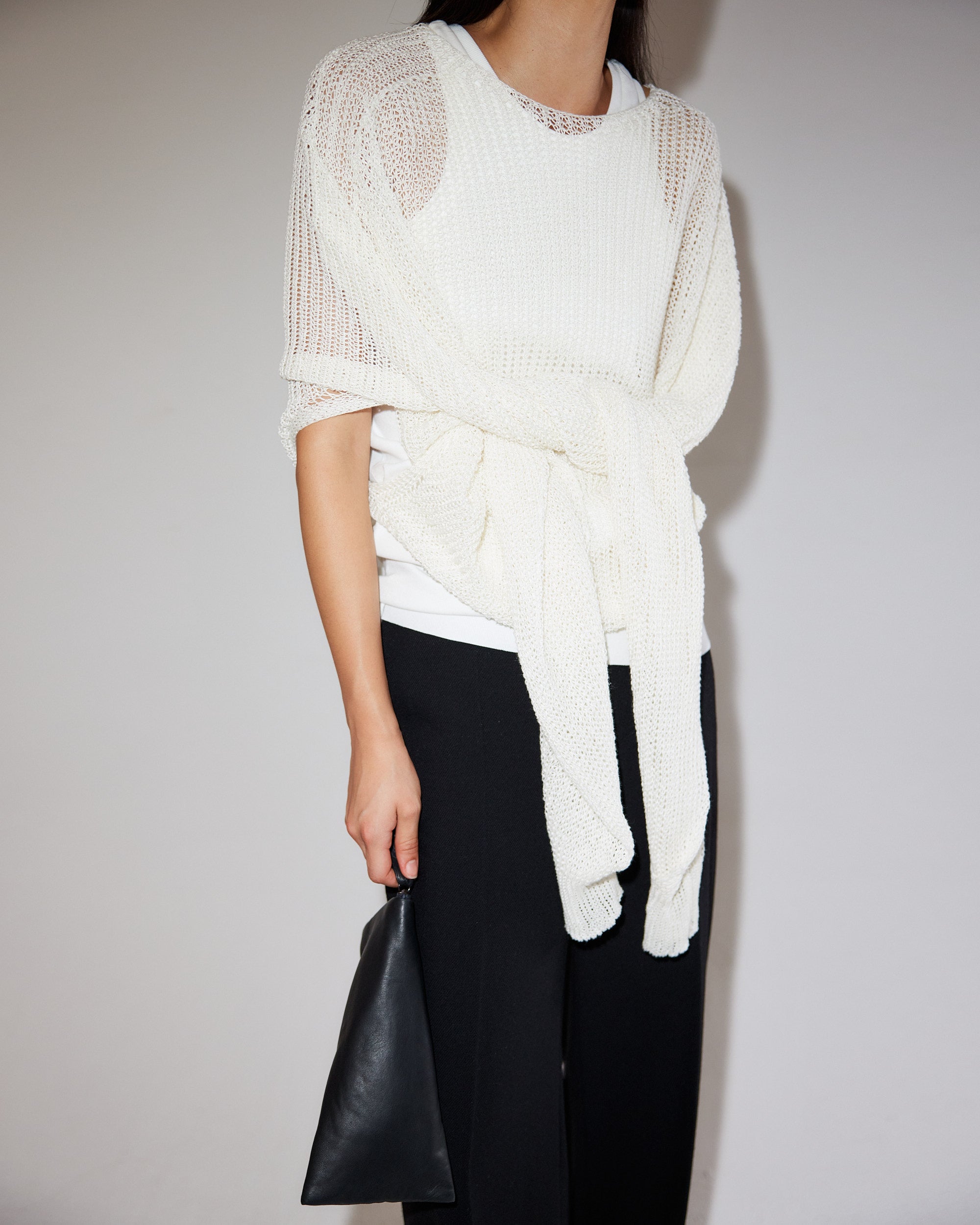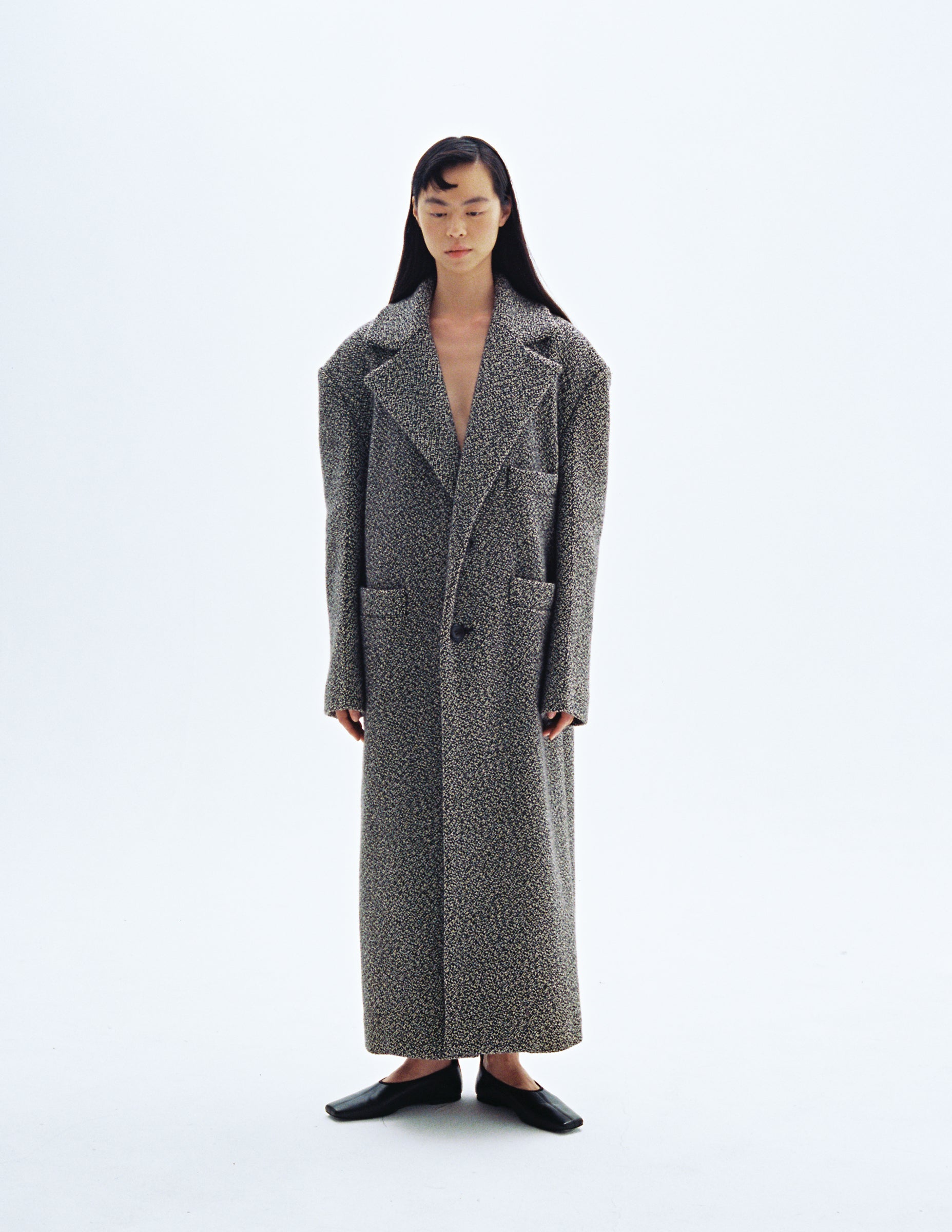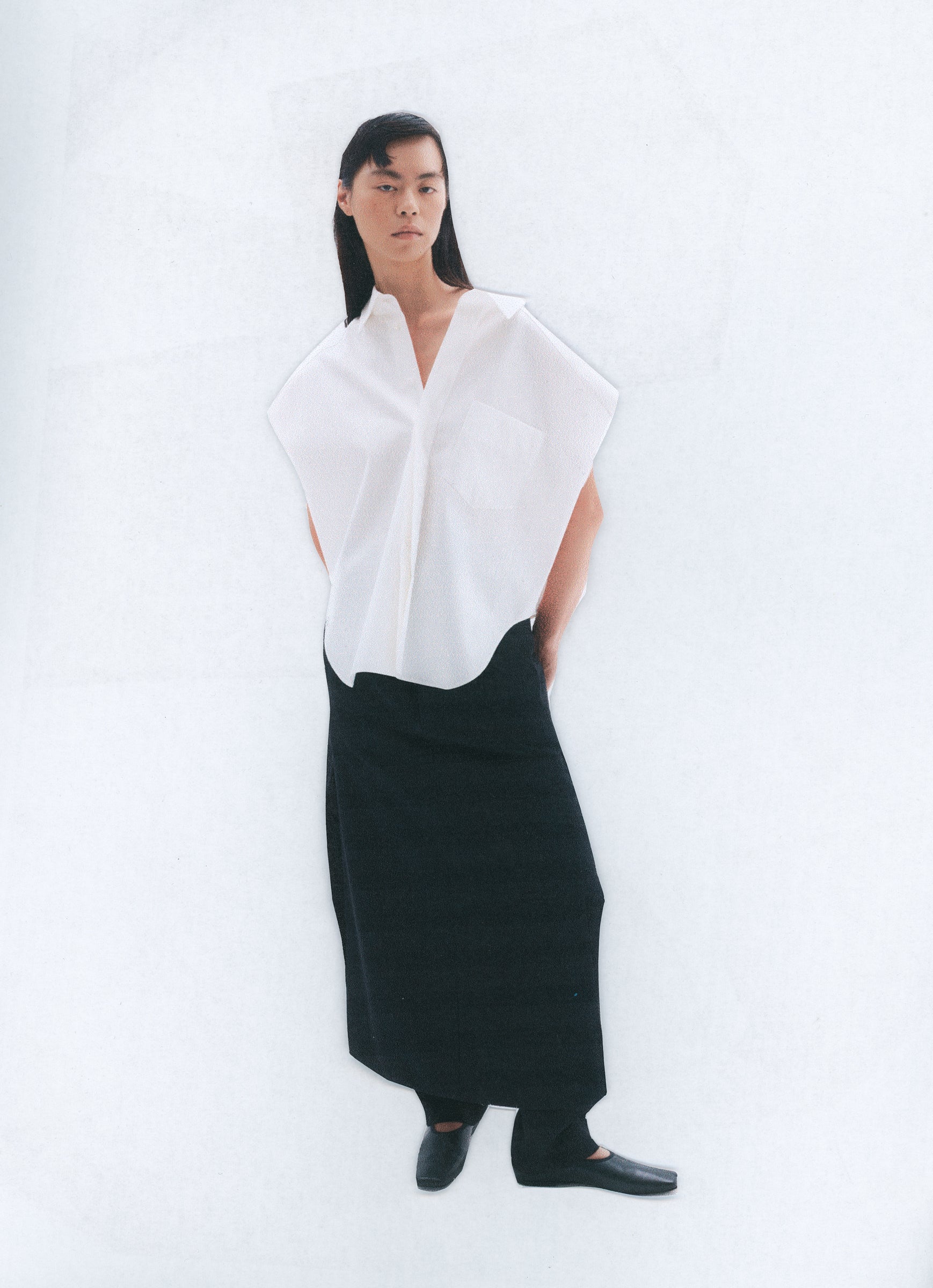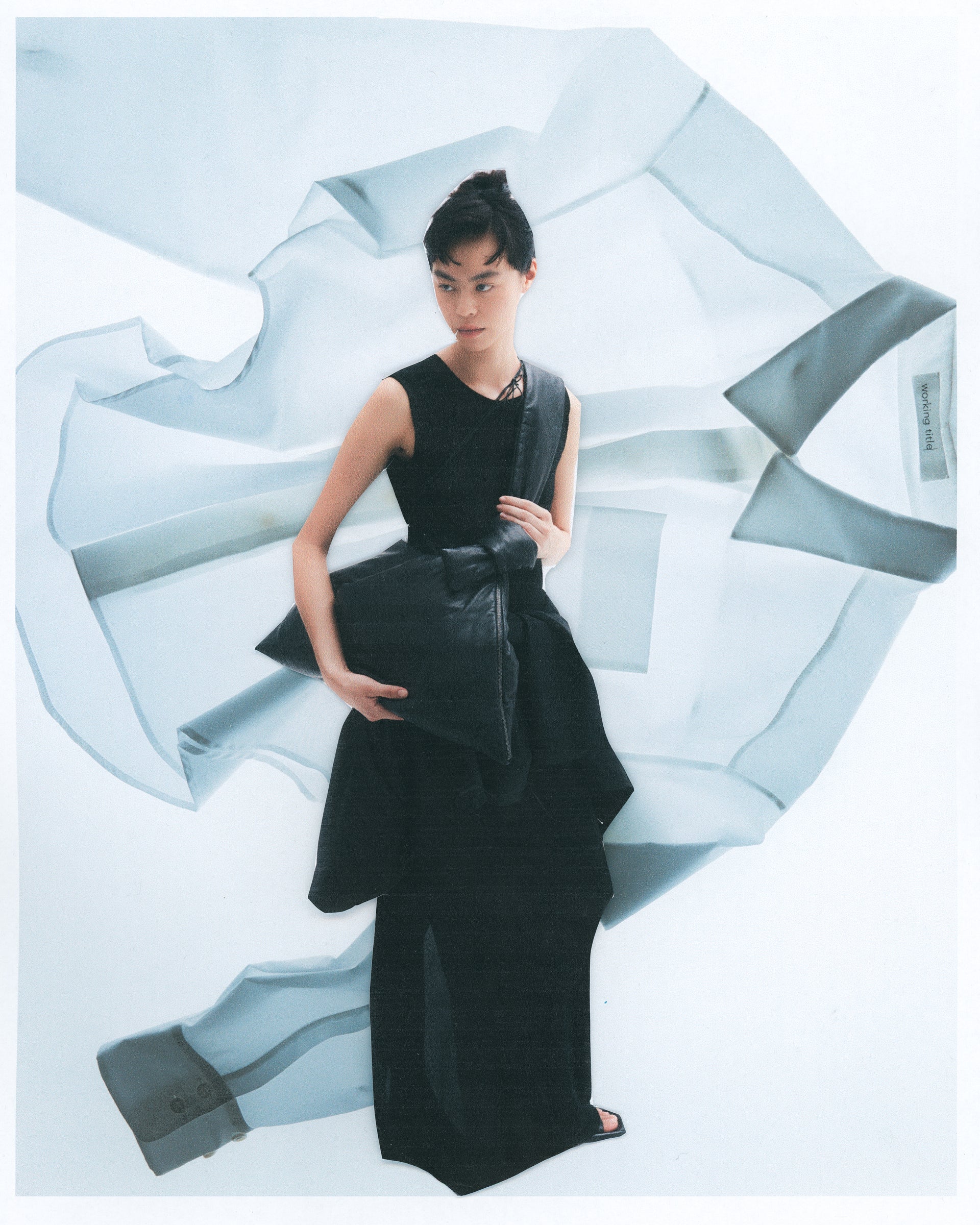working title is skillfully experimenting with minimal shapes and volumes as well as construction and reconstruction of patterns and elements of a garment.